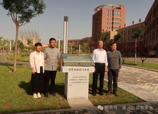 北京星河公益基金会顾问杨德贤、理事郝玉强与石匾捐赠人孟振先、孟振华姐弟一起为石匾揭幕