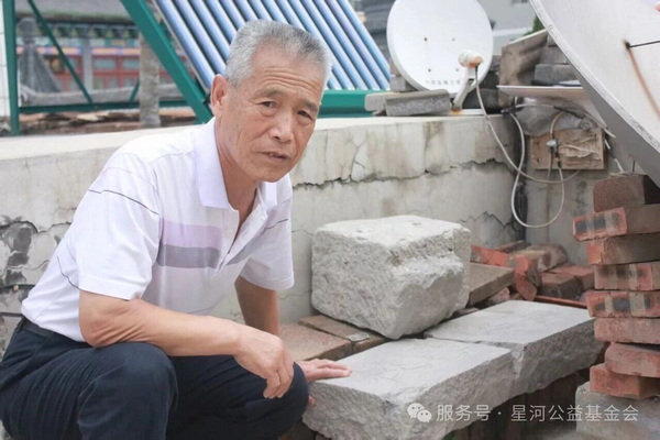 孟书江先生与其抢救回来的“育贤学校石匾”