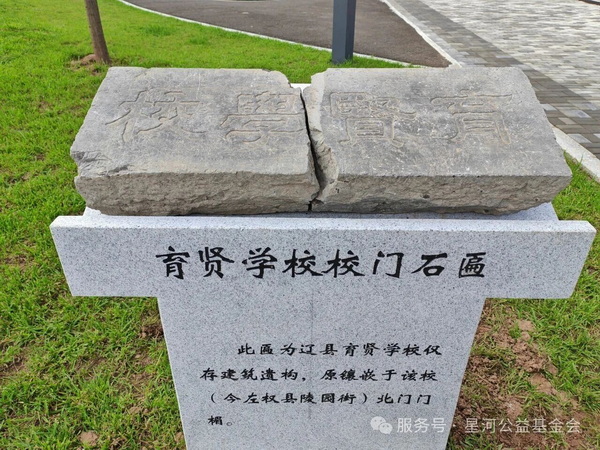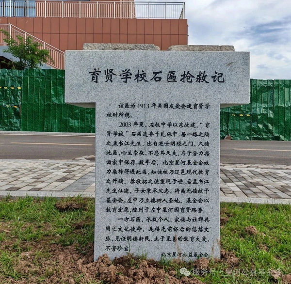 该匾为1913年美国友爱会建育贤学校时所镌。2003年夏,左权中学以东改建,“育贤学校”石匾遗弃于瓦砾中。居一路之隔之孟书江先生,出自进士明经之门,久睹此匾,心生崇敬,不忍其灭失,与子合力抬回家中保存。数年后,北京星河公益基金会反哺桑梓得遇此匾,知该校乃辽邑现代教育之开端,恭敬拓之使重现于世。后孟书江先生仙逝,子女秉承父志,将匾无偿献予基金会。左中乃立德树人圣地,基金会以教育宏愿,陈列于左中星河园育贤路旁。一方石匾,承载个人、家族与社群共同之文化使命,连接光前裕后的悠悠文脉,见证明德新民、止于至善的教育大爱,不啻珍宝。